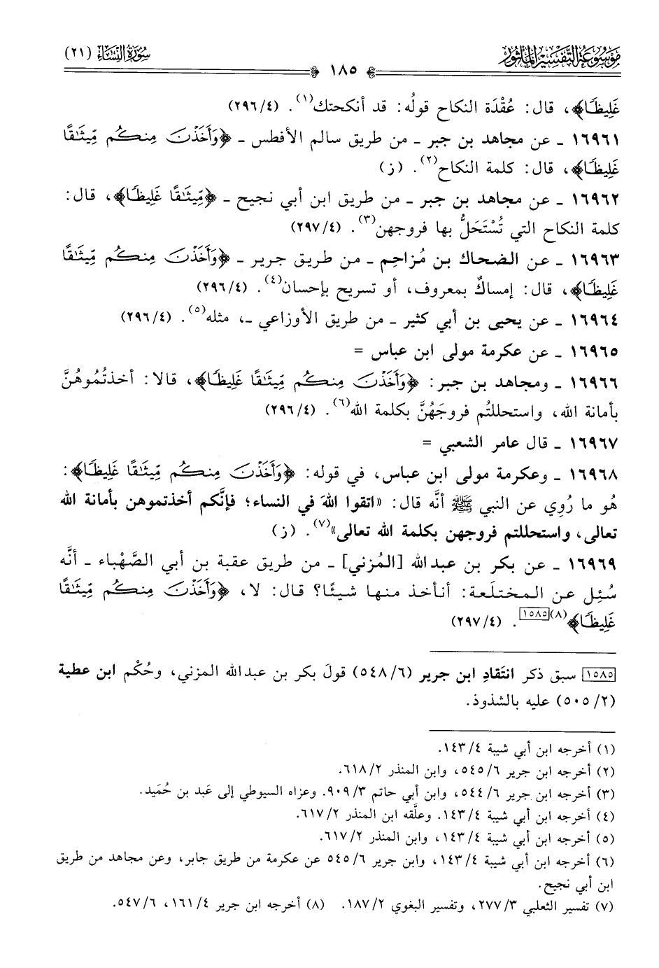١٦٩٦٢ - عن مجاهد بن جبر -من طريق ابن أبي نجيح- {ميثاقا غليظا}، قال: كلمة النكاح التي تُسْتَحَلُّ بها فروجهن (¬٣). (٤/ ٢٩٧)