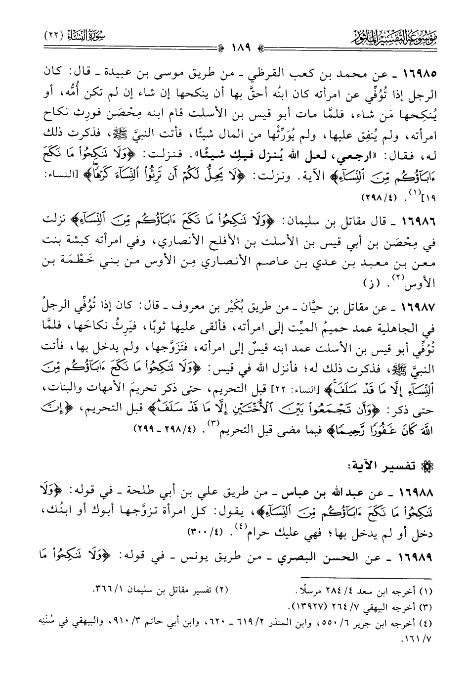 ١٦٩٨٧ - عن مقاتل بن حيّان -من طريق بُكَيْر بن معروف- قال: كان إذا تُوُفِّي الرجلُ في الجاهلية عمد حميمُ الميِّت إلى امرأته، فألقى عليها ثوبًا، فيَرِثُ نكاحَها، فلمّا تُوُفِّي أبو قيس بن الأسلت عمد ابنه قيسٌ إلى امرأته، فتَزَوَّجها، ولم يدخل بها، فأتت النبي - صلى الله عليه وسلم -، فذكرت ذلك له؛ فأنزل الله في قيس: {ولا تنكحوا ما نكح آباؤكم من النساء إلا ما قد سلف} قبل التحريم، حتى ذكر تحريمَ الأمهات والبنات، حتى ذكر: {وأن تجمعوا بين الأختين إلا ما قد سلف} قبل التحريم، {إن الله كان غفورا رحيما} فيما مضى قبل التحريم (¬٣). (٤/ ٢٩٨ - ٢٩٩)