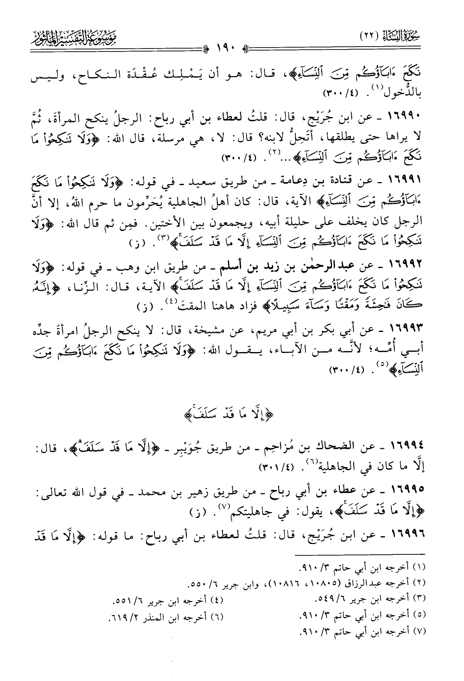 ١٦٩٩١ - عن قتادة بن دِعامة -من طريق سعيد- في قوله: {ولا تنكحوا ما نكح آباؤكم من النساء} الآية، قال: كان أهلُ الجاهلية يُحَرِّمون ما حرم اللهُ، إلا أنّ الرجل كان يخلف على حليلة أبيه، ويجمعون بين الأختين. فمِن ثم قال الله: {ولا تنكحوا ما نكح آباؤكم من النساء إلا ما قد سلف} (¬٣). (ز)
