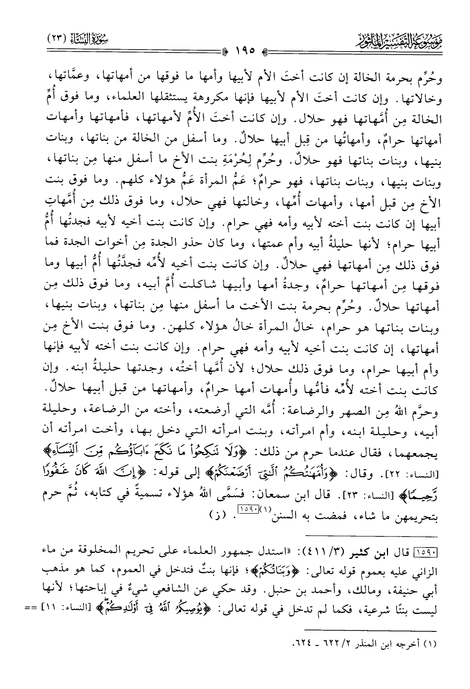 [١٥٩٠] قال ابن كثير (٣/ ٤١١): «استدل جمهور العلماء على تحريم المخلوقة من ماء الزاني عليه بعموم قوله تعالى: {وبناتكم}؛ فإنها بنتٌ فتدخل في العموم، كما هو مذهب أبي حنيفة، ومالك، وأحمد بن حنبل. وقد حكي عن الشافعي شيءٌ في إباحتها؛ لأنها ليست بنتًا شرعية، فكما لم تدخل في قوله تعالى: {يوصيكم الله في أولادكم} فإنها لا ترث بالإجماع، فكذلك لا تدخل في هذه الآية».