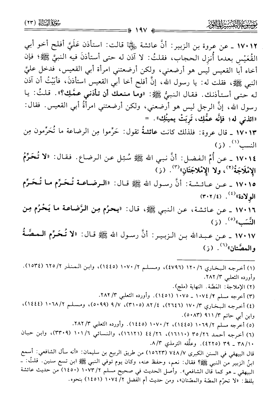١٧٠١٢ - عن عروة بن الزبير، أنّ عائشة - رضي الله عنها - قالت: استأذن عَلَيَّ أفلح أخو أبي القُعَيْسِ بعدما أُنزِل الحجاب، فقلتُ: لا آذن له حتى أستأذنَ فيه النبي - صلى الله عليه وسلم -؛ فإن أخاه أبا القعيس ليس هو أرضعني، ولكن أرضعتني امرأة أبي القعيس، فدخل عليَّ النبي - صلى الله عليه وسلم -، فقلت له: يا رسول الله، إنّ أفلح أخا أبي القعيس استأذنَ، فأبَيْتُ أن آذن له حتى أستأذنك. فقال النبي - صلى الله عليه وسلم -: «وما منعك أن تأذني عمَّكِ؟». قلتُ: يا رسول الله، إنّ الرجل ليس هو أرضعني، ولكن أرضعتني امرأةُ أبي القعيس. فقال: «ائذني له؛ فإنّه عمُّكِ، تَرِبَتْ يمينُكِ». =