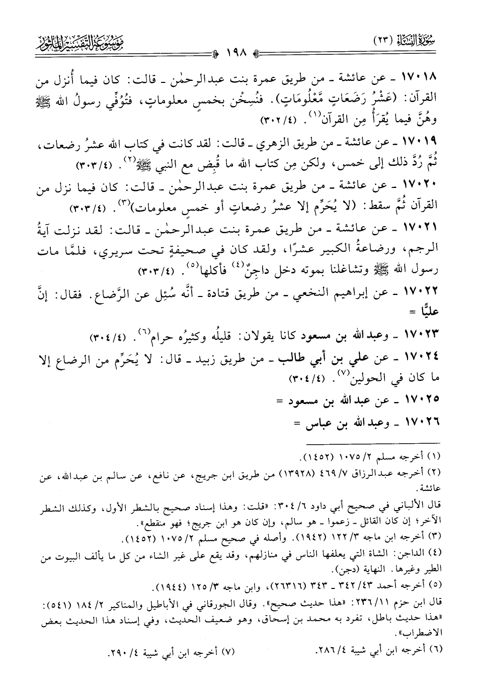 ١٧٠٢٠ - عن عائشة -من طريق عمرة بنت عبد الرحمن- قالت: كان فيما نزل من القرآن ثُمَّ سقط: (لا يُحَرِّم إلا عشرُ رضعاتٍ أو خمسٍ معلومات) (¬٣). (٤/ ٣٠٣)