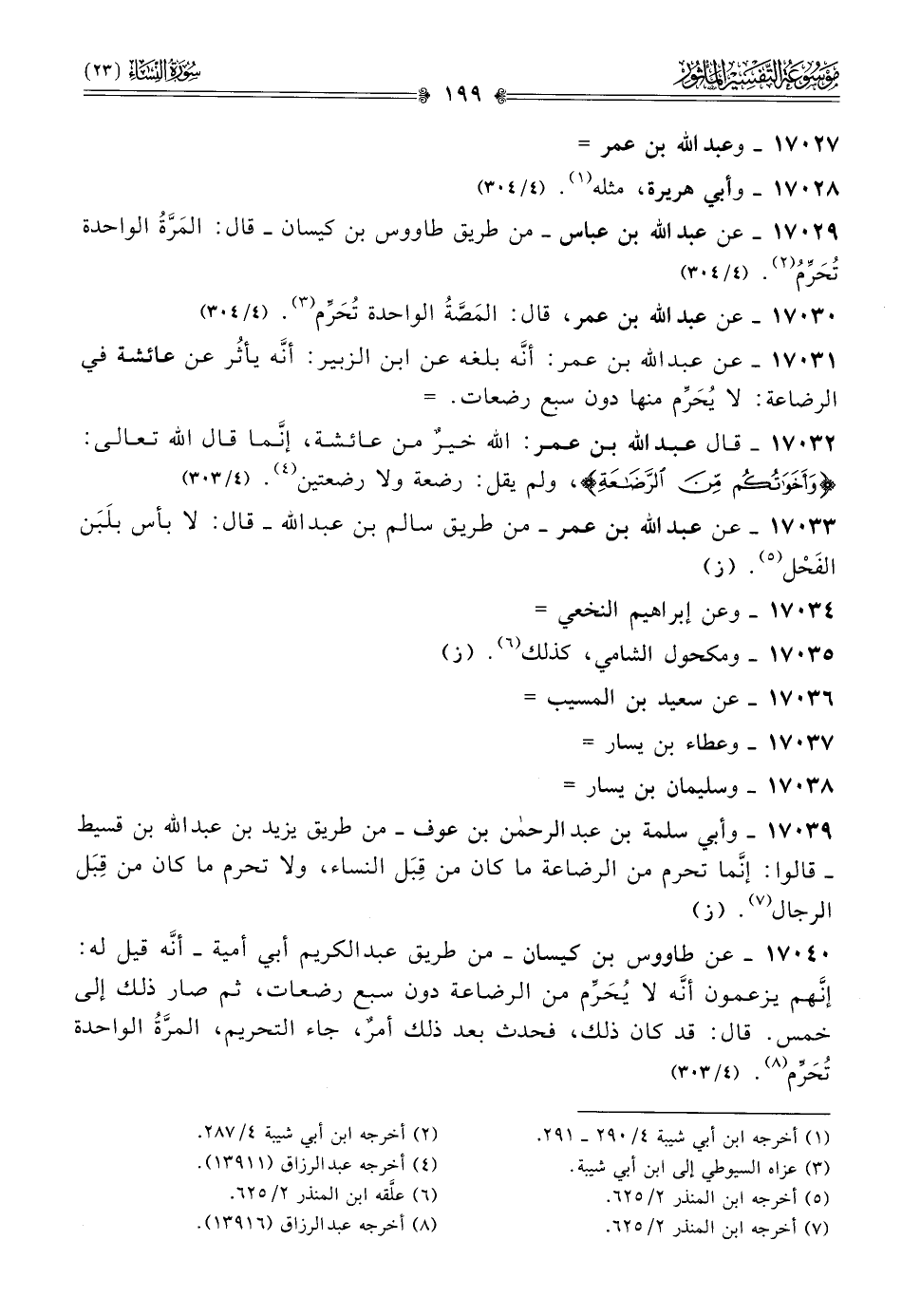 ١٧٠٣٠ - عن عبد الله بن عمر، قال: المَصَّةُ الواحدة تُحَرِّم (¬٣). (٤/ ٣٠٤)