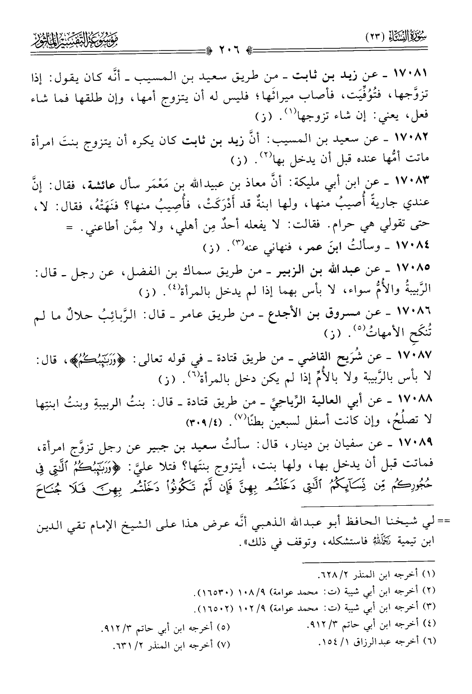 ١٧٠٨٧ - عن شُرَيح القاضي -من طريق قتادة- في قوله تعالى: {وربائبكم}، قال: لا بأس بالرَّبيبة ولا بالأُمِّ إذا لم يكن دخل بالمرأة (¬٦). (ز)