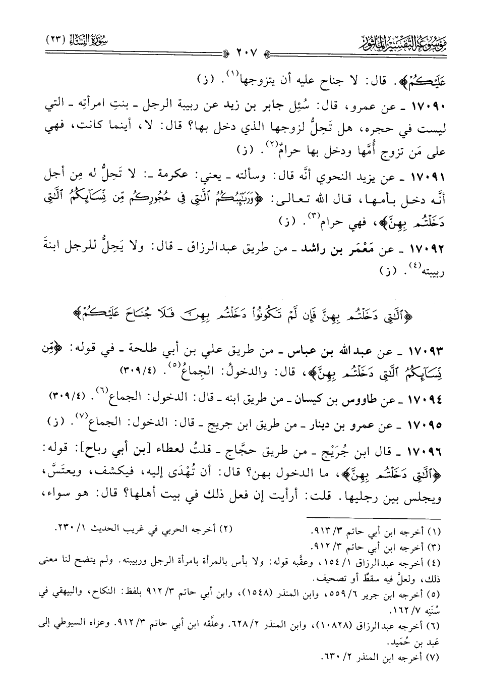 ١٧٠٩١ - عن يزيد النحوي أنّه قال: وسألته -يعني عكرمة-: لا تَحِلُّ له مِن أجل أنّه دخل بأمها، قال الله تعالى: {وربائبكم اللاتي في حجوركم من نسائكم اللاتي دخلتم بهن}، فهي حرام (¬٣). (ز)