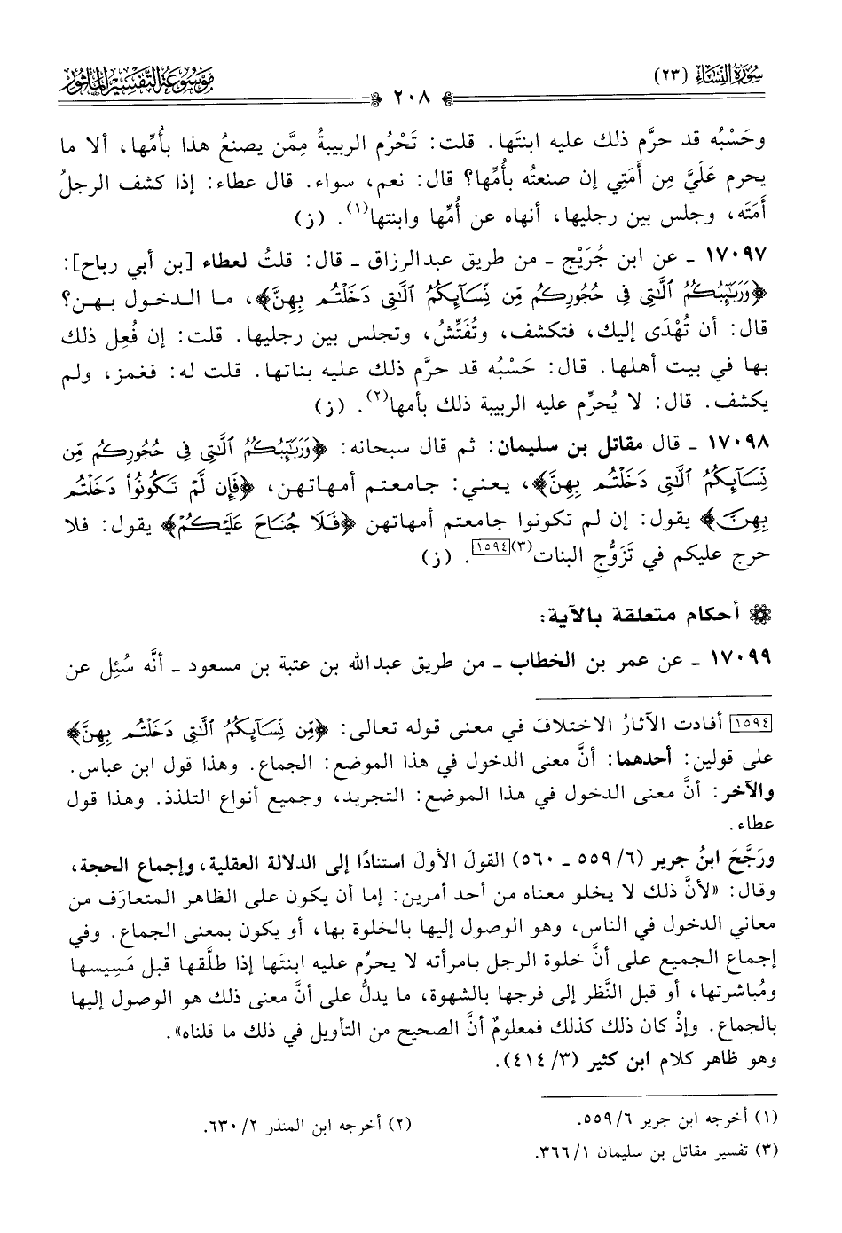 ١٧٠٩٧ - عن ابن جُرَيْج -من طريق عبد الرزاق- قال: قلتُ لعطاء [بن أبي رباح]: {وربائبكم اللاتي في حجوركم من نسائكم اللاتي دخلتم بهن}، ما الدخول بهن؟ قال: أن تُهْدى إليك، فتكشف، وتُفَتِّشُ، وتجلس بين رجليها. قلت: إن فُعِل ذلك بها في بيت أهلها. قال: حَسْبُه قد حرَّم ذلك عليه بناتها. قلت له: فغمز، ولم يكشف. قال: لا يُحرِّم عليه الربيبة ذلك بأمها (¬٢).