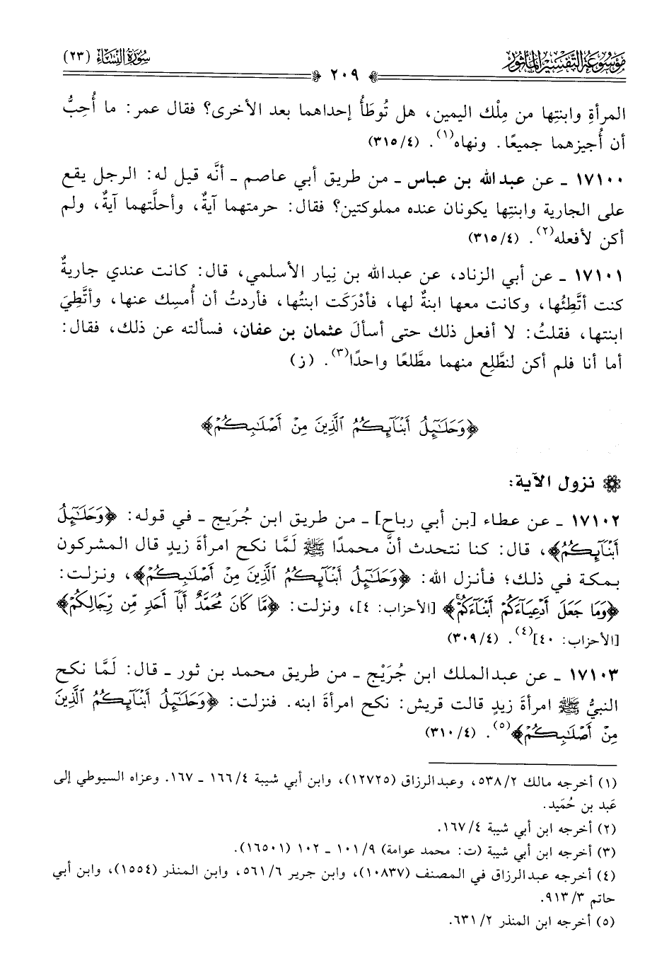 ١٧١٠٣ - عن عبد الملك ابن جُرَيْج -من طريق محمد بن ثور- قال: لَمّا نكح النبي - صلى الله عليه وسلم - امرأةَ زيدٍ قالت قريش: نكح امرأةَ ابنه. فنزلت: {وحلائل أبنائكم الذين من أصلابكم} (¬٥). (٤/ ٣١٠)