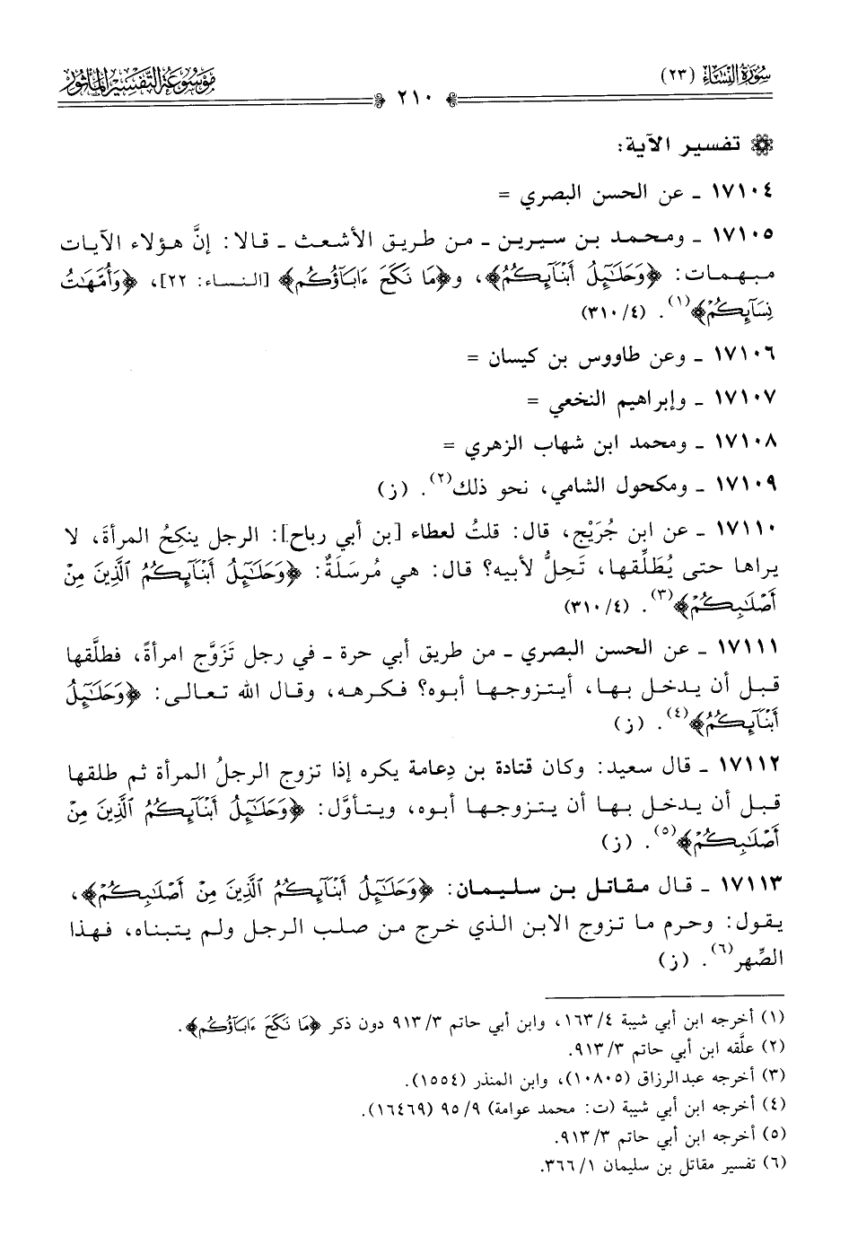 ١٧١٠٥ - ومحمد بن سيرين -من طريق الأشعث- قالا: إنّ هؤلاء الآيات مبهمات: {وحلائل أبنائكم}، و {ما نكح آباؤكم}، {وأمهات نسائكم} (¬١). (٤/ ٣١٠)