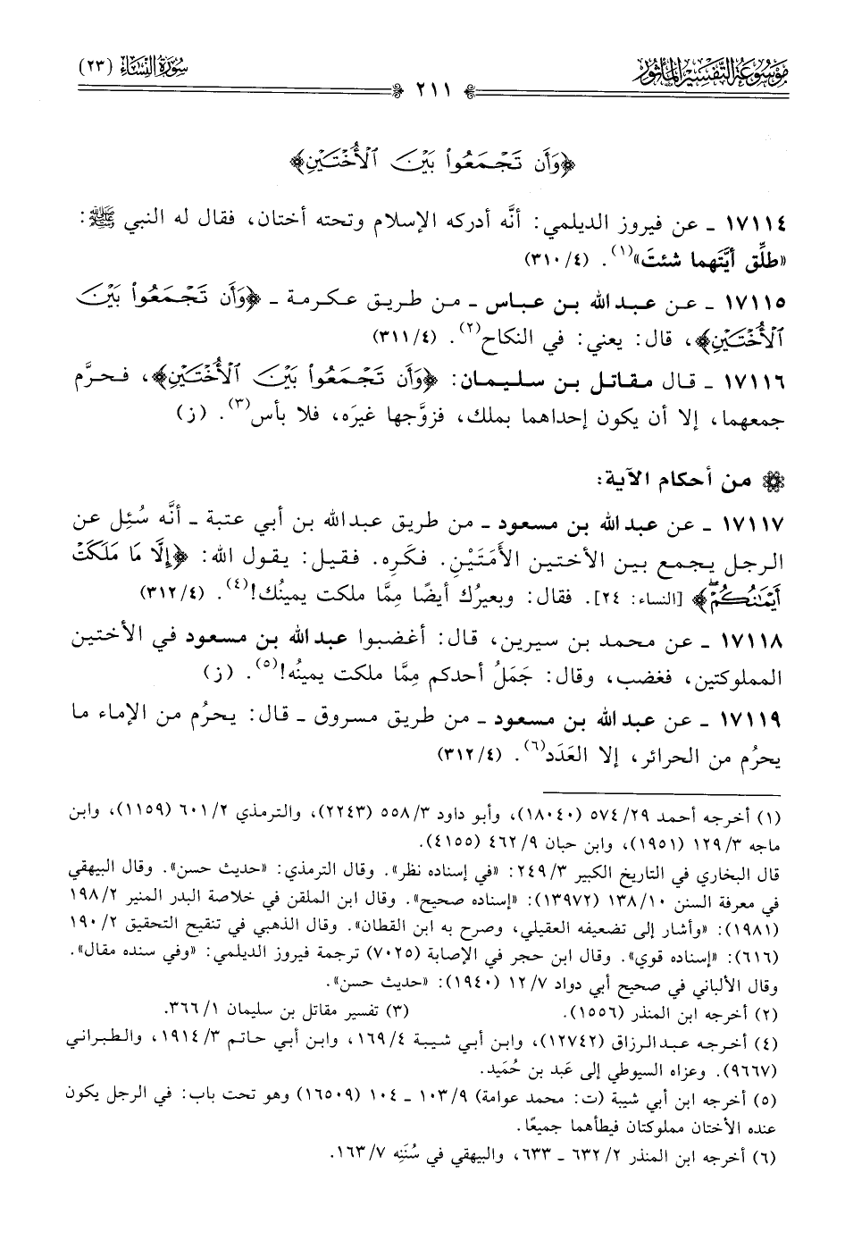 ١٧١١٥ - عن عبد الله بن عباس -من طريق عكرمة- {وأن تجمعوا بين الأختين}، قال: يعني: في النكاح (¬٢). (٤/ ٣١١)