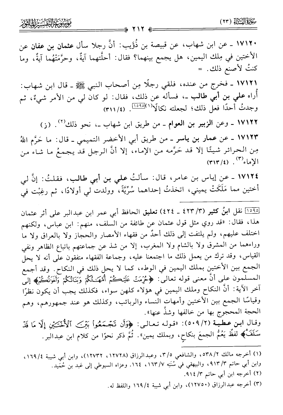 [١٥٩٥] نقل ابنُ كثير (٣/ ٤٢٣ - ٤٢٤) تعليق الحافظ أبي عمر ابن عبد البر على أثر عثمان هذا، فقال: «قد روي مثل قول عثمان عن طائفة من السلف، منهم: ابن عباس، ولكنهم اختلف عليهم، ولم يلتفت إلى ذلك أحدٌ من فقهاء الأمصار والحجاز ولا بالعراق ولا ما وراءهما من المشرق ولا بالشام ولا المغرب، إلا من شذ عن جماعتهم باتباع الظاهر ونفي القياس، وقد ترك من يعمل ذلك ما اجتمعنا عليه، وجماعة الفقهاء متفقون على أنه لا يحل الجمع بين الأختين بملك اليمين في الوطء، كما لا يحل ذلك في النكاح. وقد أجمع المسلمون على أنّ معنى قوله تعالى: {حرمت عليكم أمهاتكم وبناتكم وأخواتكم} إلى آخر الآية: أنّ النكاح وملك اليمين في هؤلاء كلهن سواء، فكذلك يجب أن يكون نظرًا وقياسًا الجمع بين الأختين وأمهات النساء والربائب، وكذلك هو عند جمهورهم، وهم الحجة المحجوج بها من خالفها وشذَّ عنها».