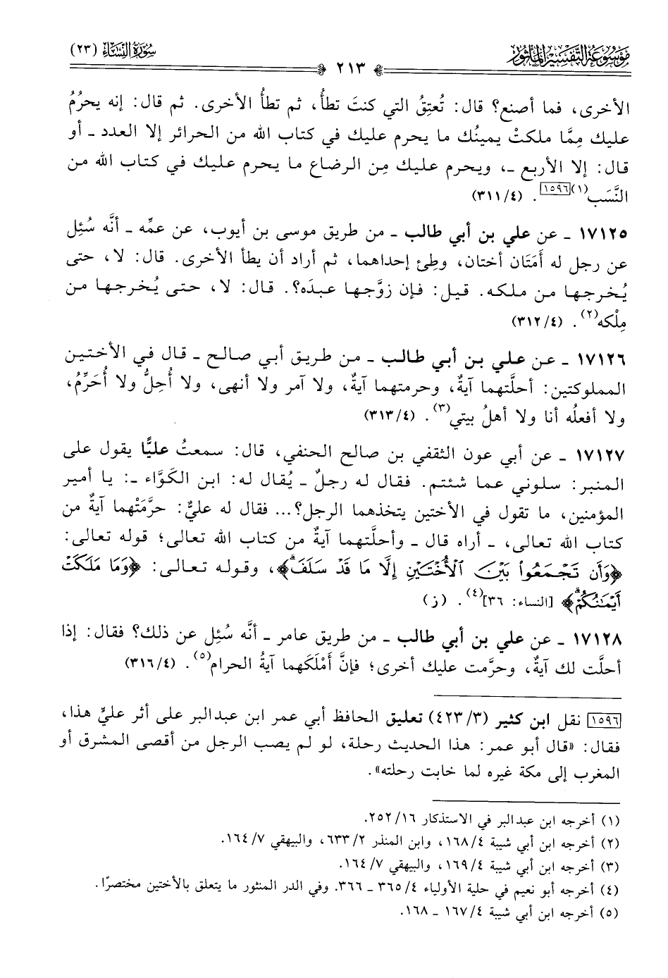 ١٧١٢٧ - عن أبي عون الثقفي بن صالح الحنفي، قال: سمعتُ عليًّا يقول على المنبر: سلوني عما شئتم. فقال له رجلٌ -يُقال له: ابن الكَوّاء-: يا أمير المؤمنين، ما تقول في الأختين يتخذهما الرجل؟ ... فقال له عليٌّ: حرَّمَتْهما آيةٌ من كتاب الله تعالى، -أراه قال- وأحلَّتهما آيةٌ من كتاب الله تعالى؛ قوله تعالى: {وأن تجمعوا بين الأختين إلا ما قد سلف}، وقوله تعالى: {وما ملكت أيمانكم} [النساء: ٣٩] (¬٤). (ز)