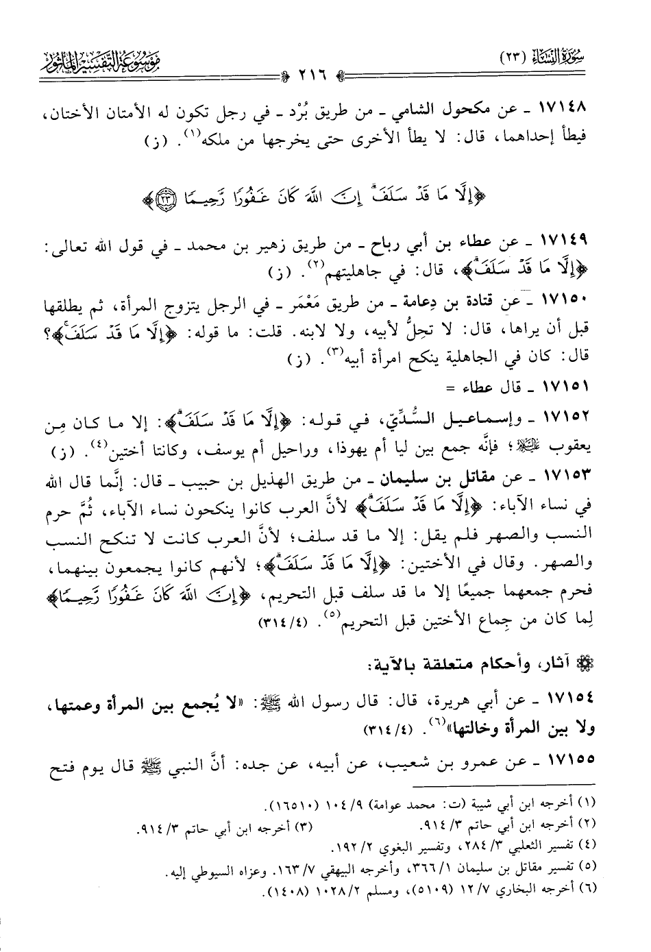 ١٧١٥٣ - عن مقاتل بن سليمان -من طريق الهذيل بن حبيب- قال: إنّما قال الله في نساء الآباء: {إلا ما قد سلف} لأنّ العرب كانوا ينكحون نساء الآباء، ثُمَّ حرم النسب والصهر فلم يقل: إلا ما قد سلف؛ لأنّ العرب كانت لا تنكح النسب والصهر. وقال في الأختين: {إلا ما قد سلف}؛ لأنهم كانوا يجمعون بينهما، فحرم جمعهما جميعًا إلا ما قد سلف قبل التحريم، {إن الله كان غفورا رحيما} لِما كان من جِماع الأختين قبل التحريم (¬٥). (٤/ ٣١٤)