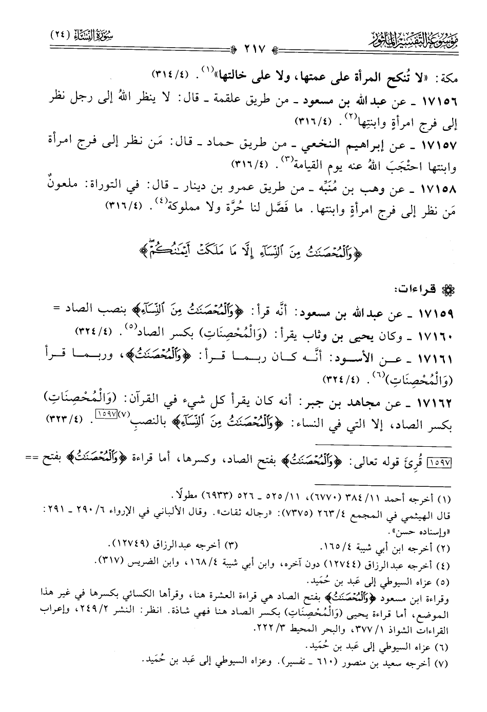١٧١٥٩ - عن عبد الله بن مسعود أنّه قرأ: {والمُحْصَناتِ مِنَ النِّسَآءِ} بنصب الصاد =