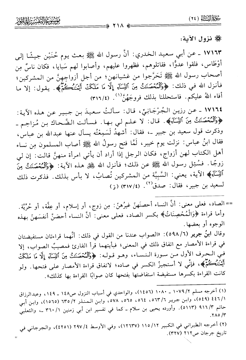 ١٧١٦٤ - عن رزين الجُرْجانِيِّ، قال: سألتُ سعيدَ بن جبير عن هذه الآية: {والمحصنات من النساء}. قال: لا علم لي بها. فسألت الضحاك بن مزاحم -وذكرت قول سعيد بن جبير-، فقال: أشهدُ لَسَمِعْتُه يسأل عنها عبد الله بن عباس، فقال ابنُ عباس: نزلت يوم خيبر، لَمّا فتح رسول الله - صلى الله عليه وسلم - أصاب المسلمون مِن نساء أهل الكتاب لهن أزواج، فكان الرجل إذا أراد أن يأتي امرأة منهنَّ قالت: إن لي زوجًا. فسُئِل رسول الله - صلى الله عليه وسلم - عن ذلك؛ فأنزل الله - عز وجل - هذه الآية: {والمحصنات من النساء} الآية. يعني: السَّبِيَّة من المشركين تُصابُ، لا بأس بذلك. فذكرت ذلك لسعيد بن جبير، فقال: صدق (¬٢). (٤/ ٣١٧) (ز)