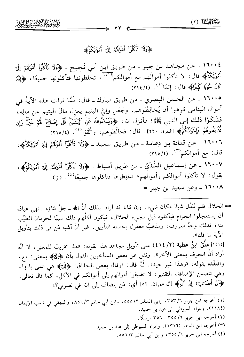 ١٦٠٠٤ - عن مجاهد بن جبر -من طريق ابن أبي نَجِيح- {ولا تأكلوا أموالهم إلى أموالكم} قال: لا تأكلوا أموالَهم مع أموالكم [١٥١٤]، تخلطونها فتأكلونها جميعًا، {إنه كان حوبا كبيرا} قال: إثمًا (¬١). (٤/ ٢١٤)