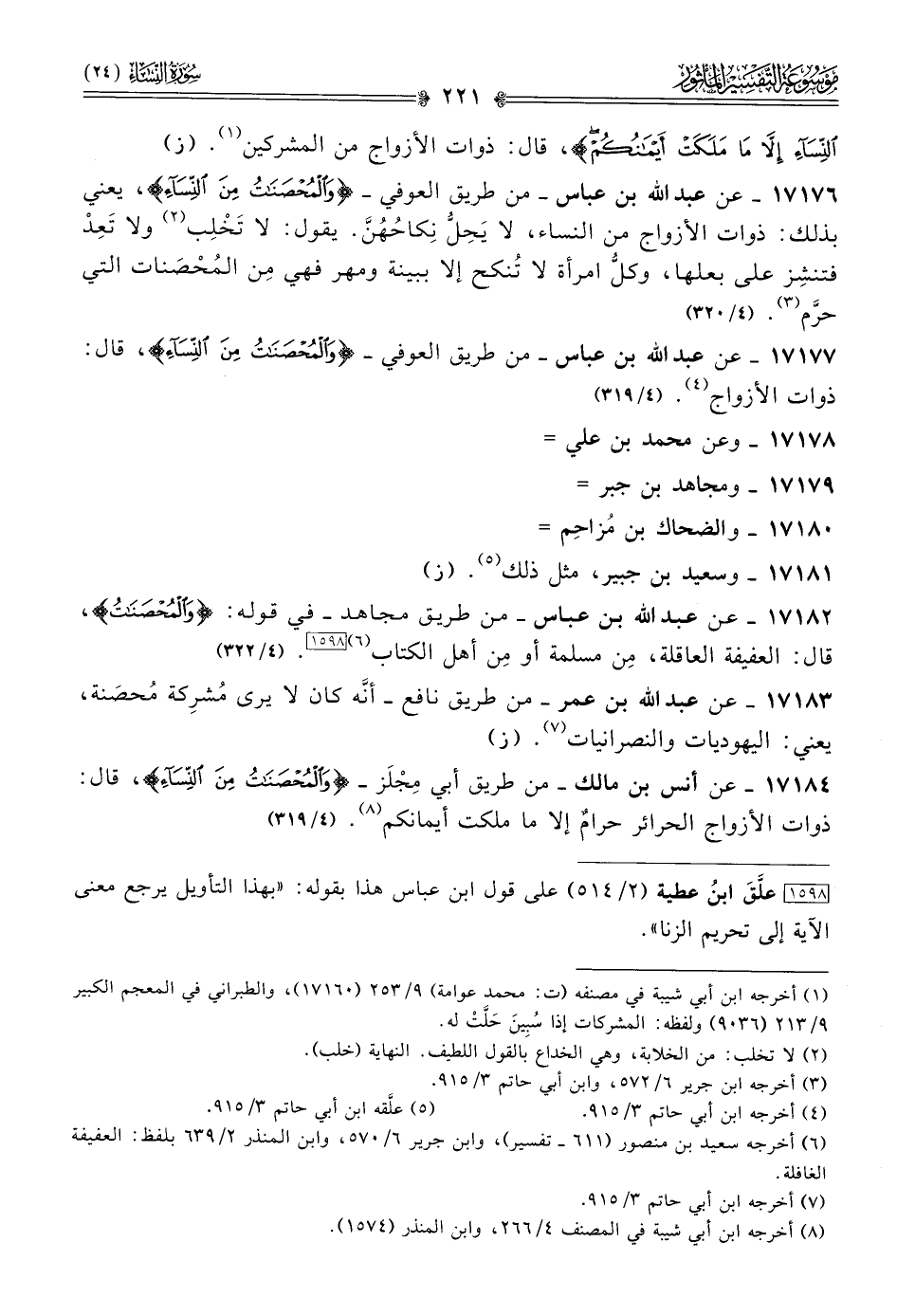 ١٧١٧٧ - عن عبد الله بن عباس -من طريق العوفي- {والمحصنات من النساء}، قال: ذوات الأزواج (¬٤). (٤/ ٣١٩)