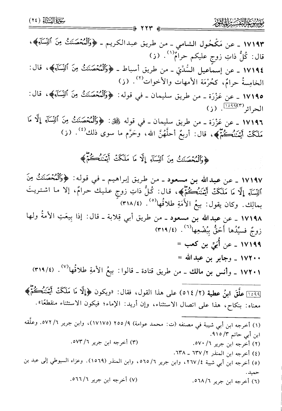 ١٧١٩٧ - عن عبد الله بن مسعود -من طريق إبراهيم- في قوله: {والمحصنات من النساء إلا ما ملكت أيمانكم}، قال: كُلُّ ذاتِ زوجٍ عليك حرامٌ، إلا ما اشتريتَ بمالِك. وكان يقول: بيعُ الأَمَةِ طلاقُها (¬٥). (٤/ ٣١٨)