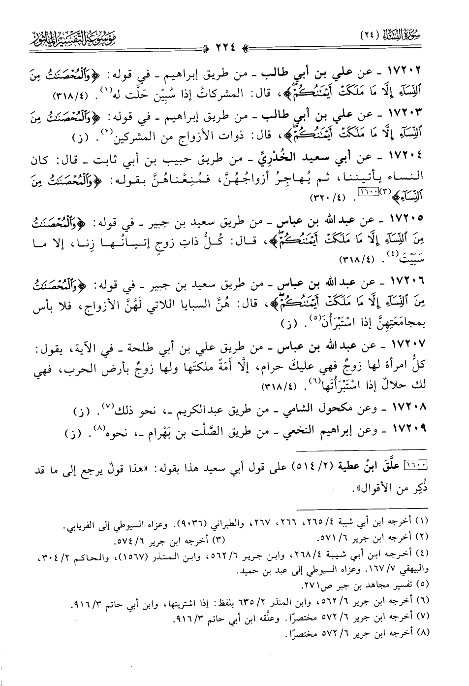 ١٧٢٠٥ - عن عبد الله بن عباس -من طريق سعيد بن جبير- في قوله: {والمحصنات من النساء إلا ما ملكت أيمانكم}، قال: كُلُّ ذاتِ زوجٍ إتيانُها زِنا، إلا ما سَبَيْتَ (¬٤). (٤/ ٣١٨)