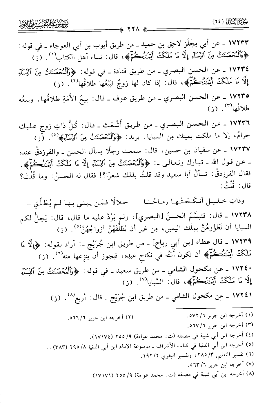 ١٧٢٣٧ - عن سفيان بن حسين، قال: سمعت رجلًا يسأل الحسن -والفرزدقُ عنده- عن قول الله -تبارك وتعالى-: {والمحصنات من النساء إلا ما ملكت أيمانكم}. فقال الفرزدقُ: تسألُ أبا سعيد وقد قلتُ بذلك شعرًا؟! فقال له الحسنُ: وما قُلْتَ؟ قال: قُلْتُ: