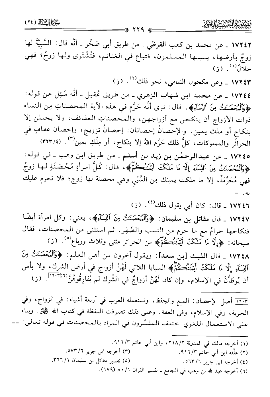 ١٧٢٤٤ - عن محمد ابن شهاب الزهري -من طريق عُقيل- أنّه سُئِل عن قوله: {والمحصنات من النساء}. قال: نرى أنّه حَرَّم في هذه الآية المحصناتِ مِن النساء ذوات الأزواج أن ينكحن مع أزواجهن، والمحصناتِ العفائف، ولا يحللن إلا بنكاحٍ أو ملك يمين. والإحصانُ إحصانان: إحصانُ تزويج، وإحصان عفافٍ في الحرائر والمملوكات، كلُّ ذلك حَرَّم اللهُ إلا بنكاح، أو مِلْكِ يمين (¬٣). (٤/ ٣٢٣)