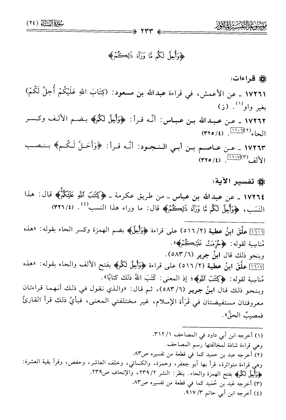 [١٦٠٧] علَّقَ ابنُ عطية (٢/ ٥١٦) على قراءة {وأَحَلَّ لكم} بفتح الألف والحاء بقوله: «هذه مُناسِبة لقوله: {كِتابَ اللَّهِ}؛ إذ المعنى: كَتَبَ اللهُ ذلك كتابًا».
