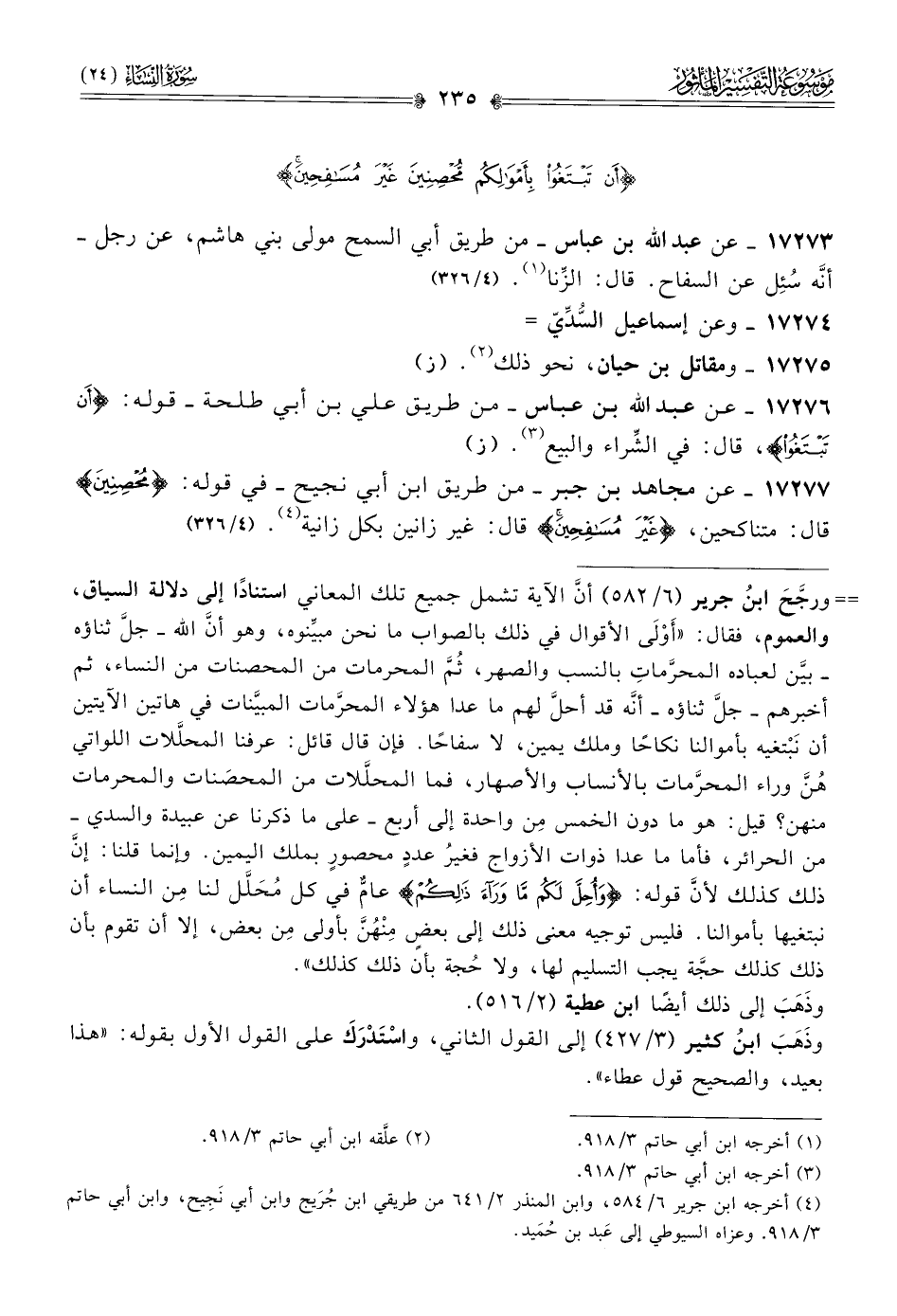 ١٧٢٧٧ - عن مجاهد بن جبر -من طريق ابن أبي نجيح- في قوله: {محصنين} قال: متناكحين، {غير مسافحين} قال: غير زانين بكل زانية (¬٤). (٤/ ٣٢٦)