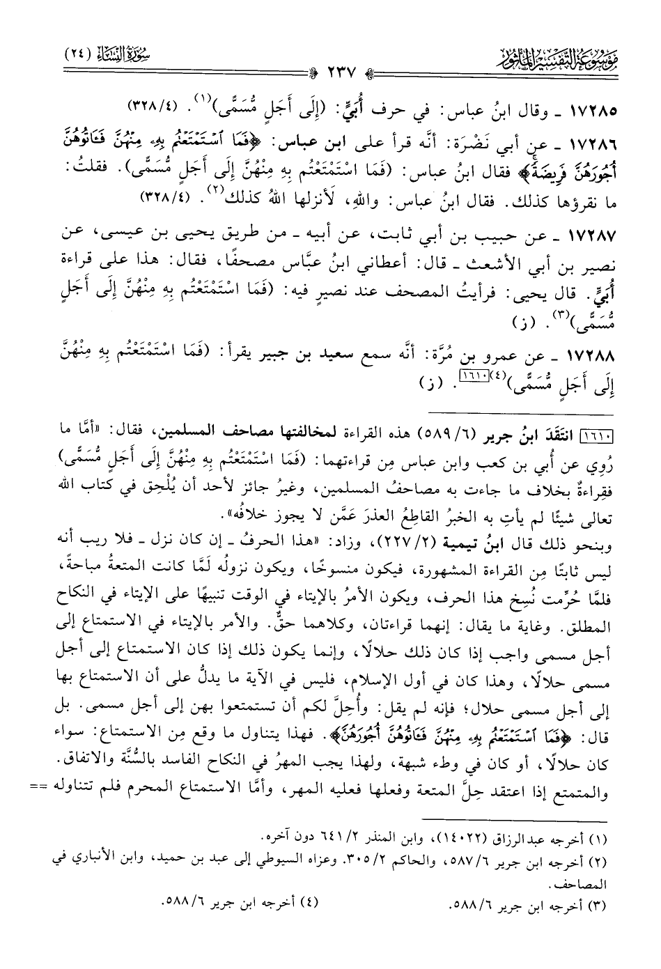 وبنحو ذلك قال ابنُ تيمية (٢/ ٢٢٧)، وزاد: «هذا الحرفُ -إن كان نزل- فلا ريب أنه ليس ثابتًا مِن القراءة المشهورة، فيكون منسوخًا، ويكون نزولُه لَمّا كانت المتعةُ مباحةً، فلمّا حُرِّمت نُسِخ هذا الحرف، ويكون الأمرُ بالإيتاء في الوقت تنبيهًا على الإيتاء في النكاح المطلق. وغاية ما يقال: إنهما قراءتان، وكلاهما حقٌّ. والأمر بالإيتاء في الاستمتاع إلى أجل مسمى واجب إذا كان ذلك حلالًا، وإنما يكون ذلك إذا كان الاستمتاع إلى أجل مسمى حلالًا، وهذا كان في أول الإسلام، فليس في الآية ما يدلُّ على أن الاستمتاع بها إلى أجل مسمى حلال؛ فإنه لم يقل: وأُحِلَّ لكم أن تستمتعوا بهن إلى أجل مسمى. بل قال: {فما استمتعتم به منهن فآتوهن أجورهن}. فهذا يتناول ما وقع مِن الاستمتاع: سواء كان حلالًا، أو كان في وطء شبهة، ولهذا يجب المهرُ في النكاح الفاسد بالسُّنَّة والاتفاق. والمتمتع إذا اعتقد حِلَّ المتعة وفعلها فعليه المهر، وأمّا الاستمتاع المحرم فلم تتناوله الآية؛ فإنّه لو استمتع بالمرأة من غير عقد مع مطاوعتها لكان زنا، ولا مهر فيه. وإن كانت مستكرهة ففيه نزاع مشهور».