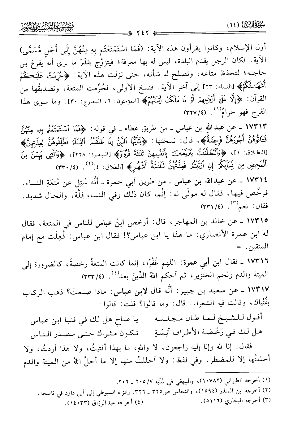 ١٧٣١٤ - عن عبد الله بن عباس -من طريق أبي جمرة- أنّه سُئِل عن مُتعَةِ النساء. فرخَّص فيها، فقال له مولًى له: إنّما كان ذلك وفي النساء قِلَّة، والحال شديد. فقال: نعم (¬٣). (٤/ ٣٣١)