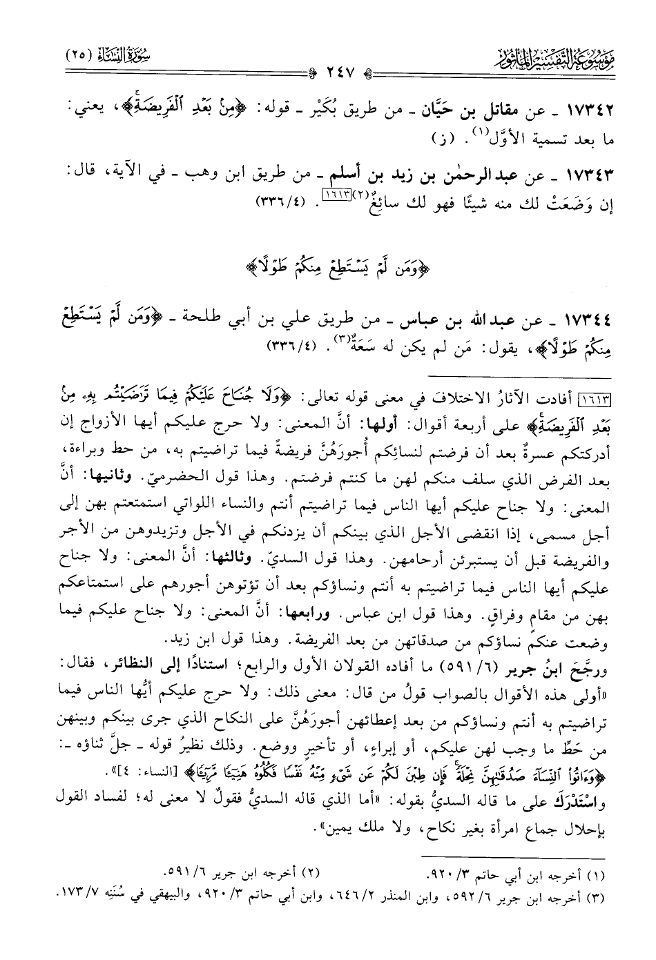 ١٧٣٤٤ - عن عبد الله بن عباس -من طريق علي بن أبي طلحة- {ومن لم يستطع منكم طولا}، يقول: مَن لم يكن له سَعَةٌ (¬٣). (٤/ ٣٣٦)