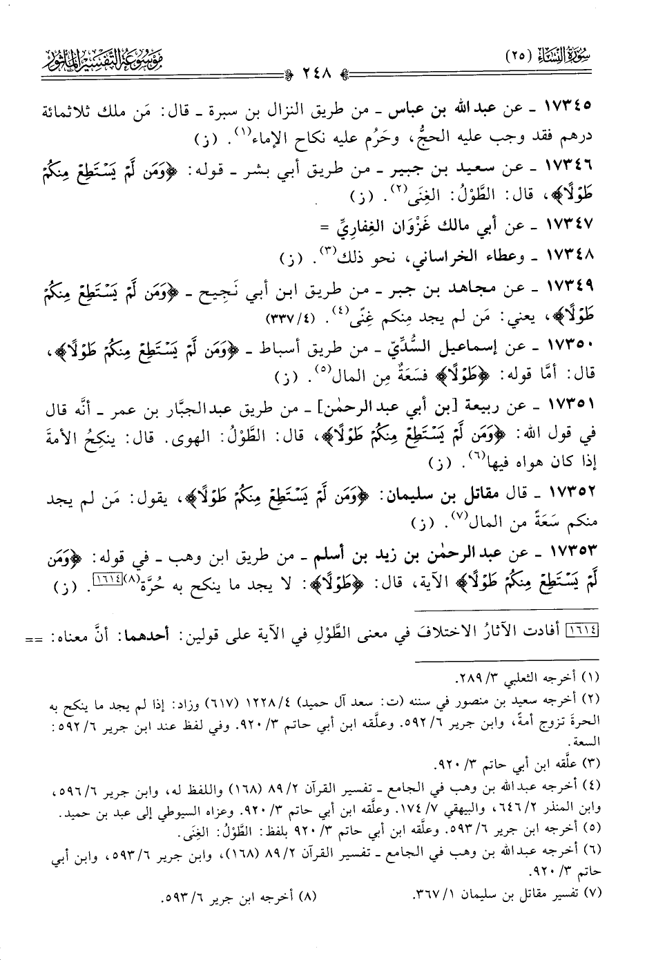 [١٦١٤] أفادت الآثارُ الاختلافَ في معنى الطَّوْلِ في الآية على قولين: أحدهما: أنّ معناه: الفضل، والمال، والسّعة. وهذا قول ابن عباس، ومجاهد، وسعيد بن جبير، وقتادة، وابن زيد، والسدي. والآخر: المراد: أنّ معناه: الهوى. وهذا قول ربيعة، وإبراهيم النخعي، وجابر، وعطاء.