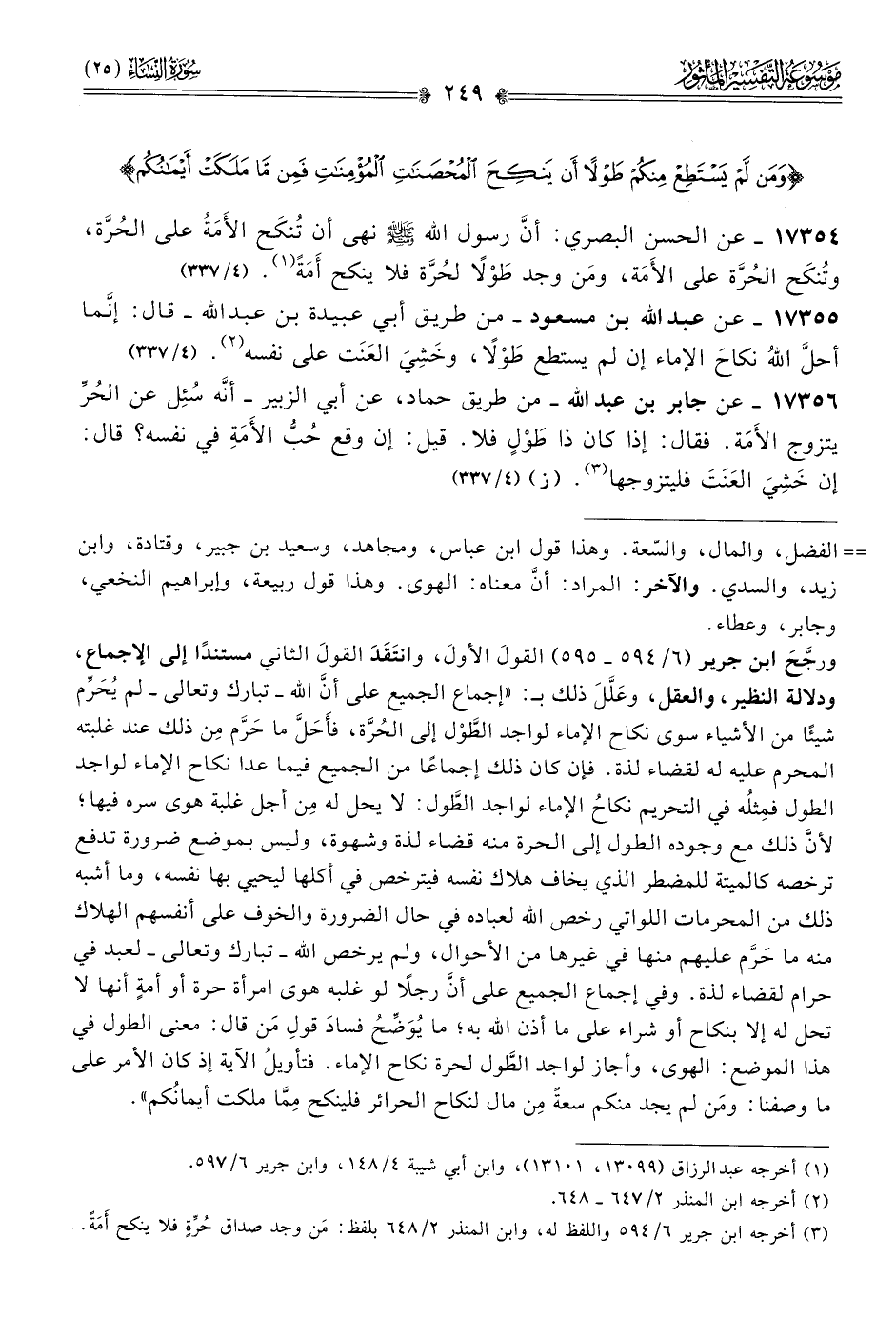 (¬٣) أخرجه ابن جرير ٦/ ٥٩٤ واللفظ له، وابن المنذر ٢/ ٦٤٨ بلفظ: مَن وجد صداق حُرِّةٍ فلا ينكح أمَةً.