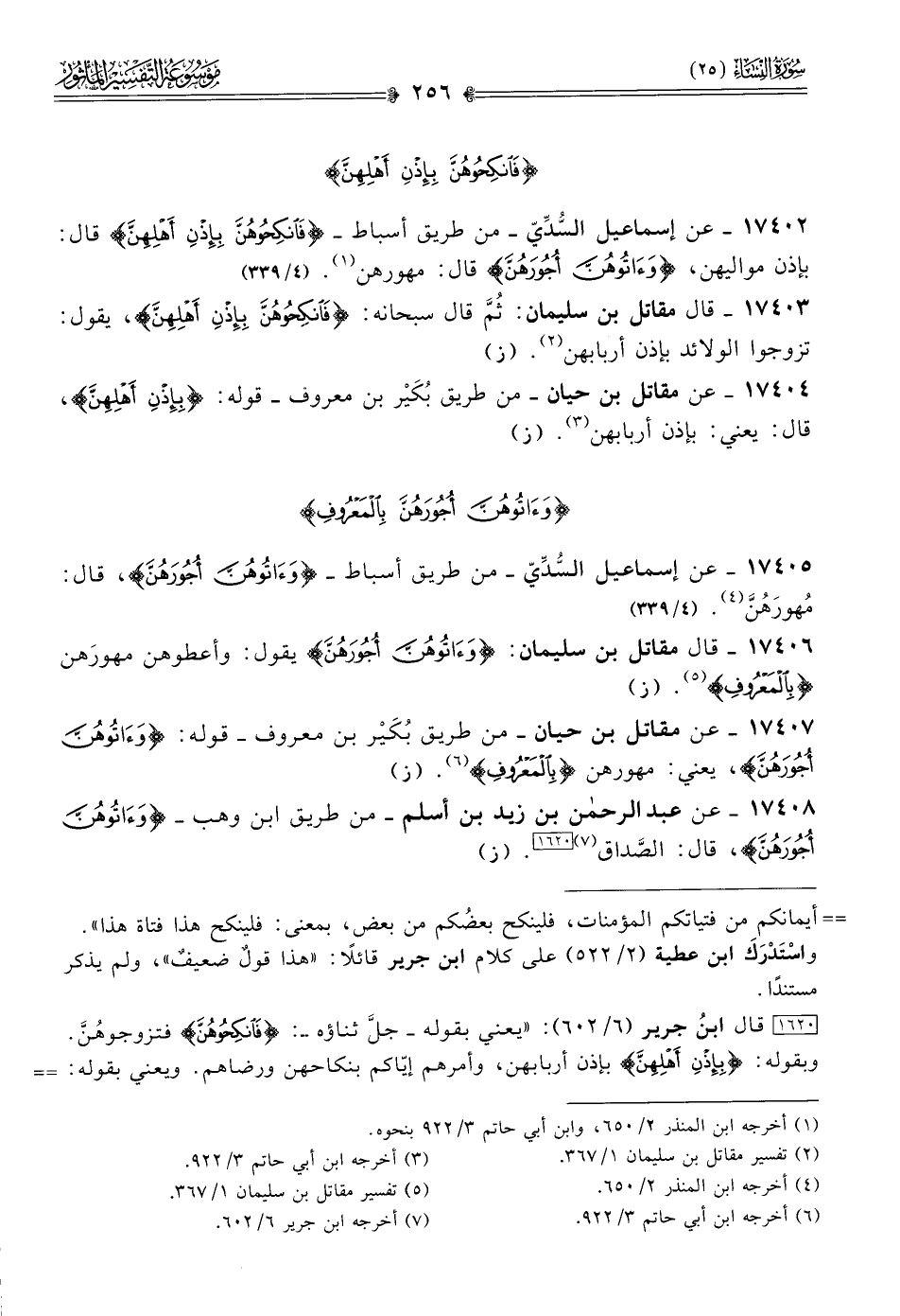 ١٧٤٠٥ - عن إسماعيل السُّدِّيّ -من طريق أسباط- {وآتوهن أجورهن}، قال: مُهورَهُنَّ (¬٤). (٤/ ٣٣٩)
