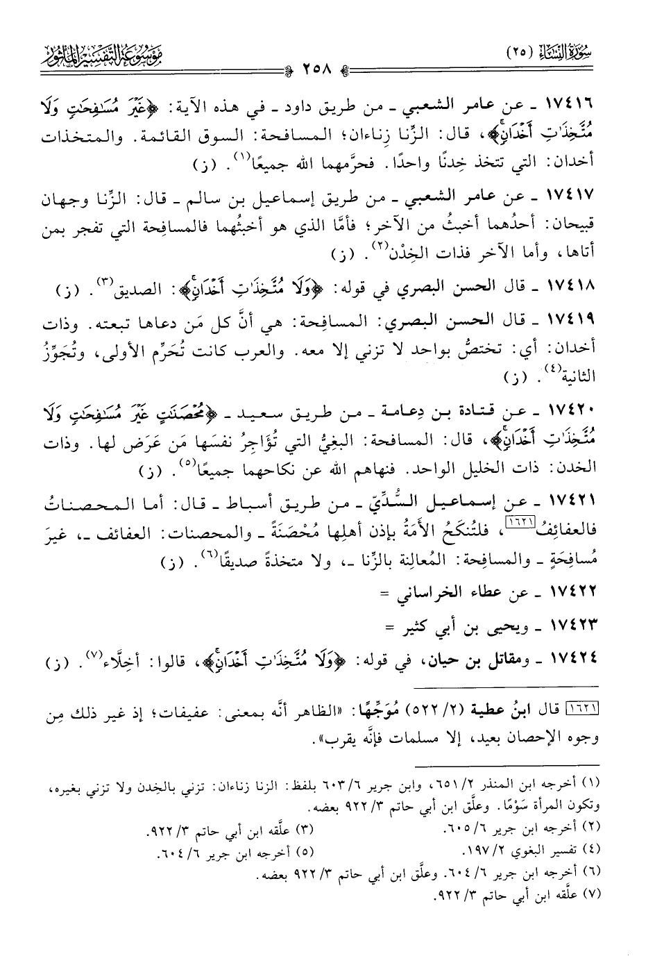 ١٧٤١٩ - قال الحسن البصري: المسافِحة: هي أنّ كل مَن دعاها تبعته. وذات أخدان: أي: تختصُّ بواحد لا تزني إلا معه. والعرب كانت تُحَرِّم الأولى، وتُجَوِّزُ الثانية (¬٤). (ز)