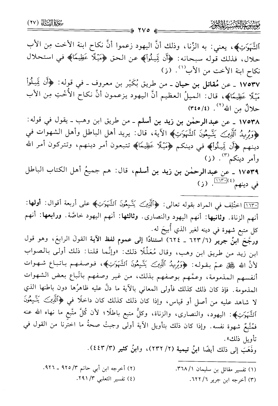 ورجَّحَ ابنُ جرير (٦/ ٦٢٣ - ٦٢٤) استنادًا إلى عموم لفظ الآية القولَ الرابعَ، وهو قول ابن زيد من طريق ابن وهب، وقال مُعَلِّلًا ذلك: «وإنّما قلنا: ذلك أولى بالصواب لأنّ الله - عز وجل - عمّ بقوله: {ويريد الذين يتبعون الشهوات}، فوصفهم باتباع شهوات أنفسهم المذمومة، وعمَّهم بوصفهم بذلك، من غير وصفهم باتّباع بعض الشهوات المذمومة. فإذ كان ذلك كذلك فأولى المعاني بالآية ما دلَّ عليه ظاهرُها دون باطنها الذي لا شاهد عليه من أصل أو قياس، وإذا كان ذلك كذلك كان داخلًا في {الذين يتبعون الشهوات}: اليهود، والنصارى، والزناة، وكلُّ متبع باطلًا؛ لأن كُلَّ متَّبعٍ ما نهاه الله عنه فمُتَّبِعٌ شهوة نفسه. وإذا كان ذلك بتأويل الآية أولى وجبتْ صحةُ ما اخترنا من القول في تأويل ذلك».وذَهَبَ إلى ذلك أيضًا ابنُ تيمية (٢/ ٢٣٢)، وابنُ كثير (٣/ ٤٤٣).
