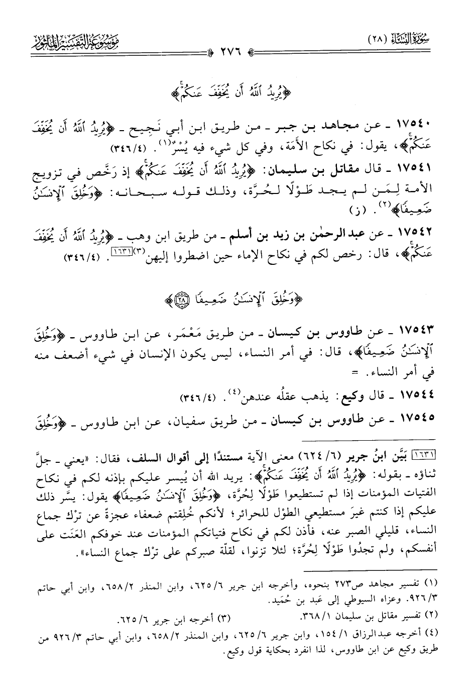 ١٧٥٤٠ - عن مجاهد بن جبر -من طريق ابن أبي نَجِيح- {يريد الله أن يخفف عنكم}، يقول: في نكاح الأَمَة، وفي كل شيء فيه يُسْرٌ (¬١). (٤/ ٣٤٦)