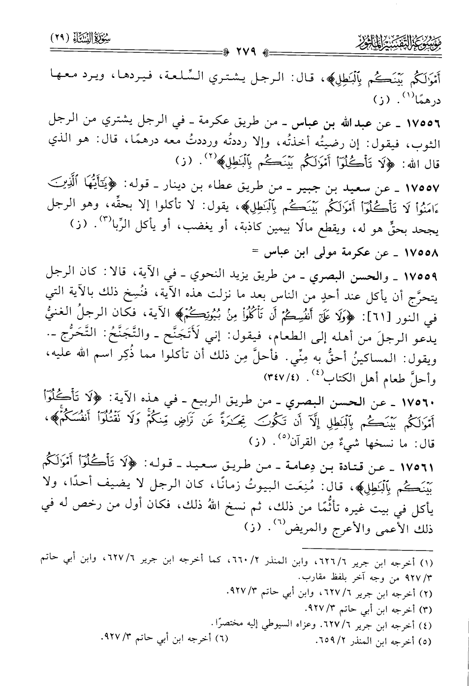 أموالكم بينكم بالباطل}، قال: الرجل يشتري السِّلعة، فيردها، ويرد معها درهمًا (¬١). (ز)