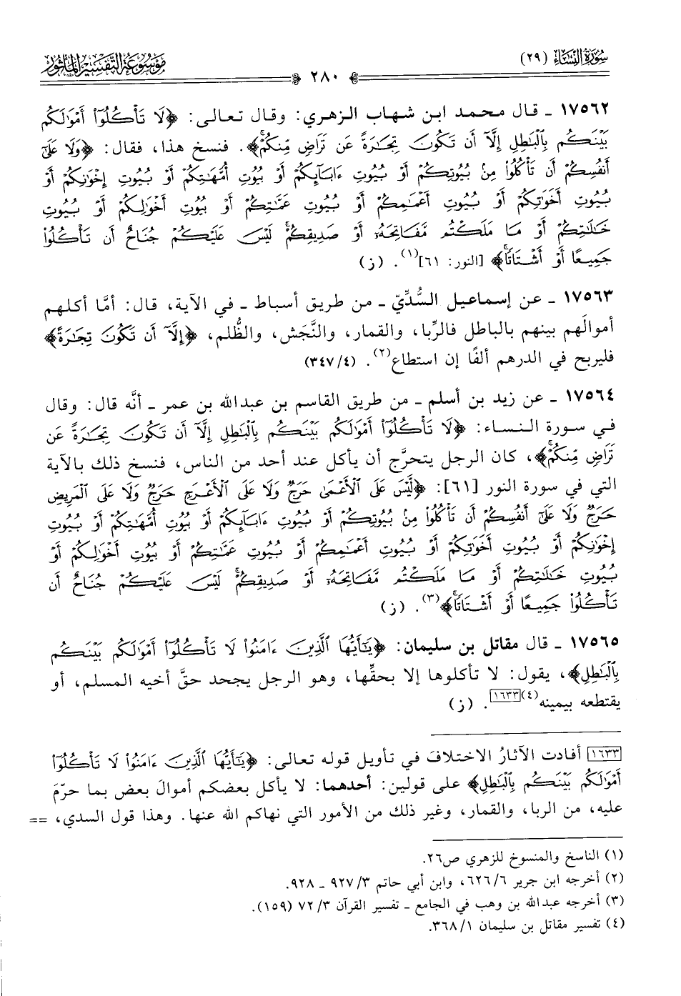 ١٧٥٦٢ - قال محمد ابن شهاب الزهري: وقال تعالى: {لا تأكلوا أموالكم بينكم بالباطل إلا أن تكون تجارة عن تراض منكم}. فنسخ هذا، فقال: {ولا على أنفسكم أن تأكلوا من بيوتكم أو بيوت آبائكم أو بيوت أمهاتكم أو بيوت إخوانكم أو بيوت أخواتكم أو بيوت أعمامكم أو بيوت عماتكم أو بيوت أخوالكم أو بيوت خالاتكم أو ما ملكتم مفاتحه أو صديقكم ليس عليكم جناح أن تأكلوا جميعا أو أشتاتا} [النور: ٦١] (¬١). (ز)