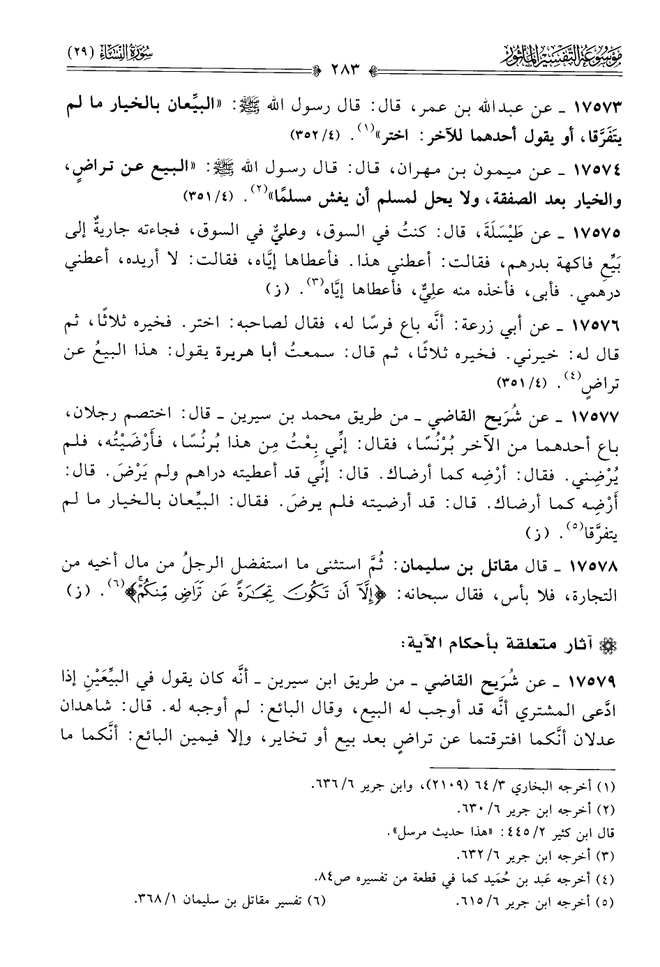 ١٧٥٧٦ - عن أبي زرعة: أنّه باع فرسًا له، فقال لصاحبه: اختر. فخيره ثلاثًا، ثم قال له: خيرني. فخيره ثلاثًا، ثم قال: سمعتُ أبا هريرة يقول: هذا البيعُ عن تراضٍ (¬٤). (٤/ ٣٥١)