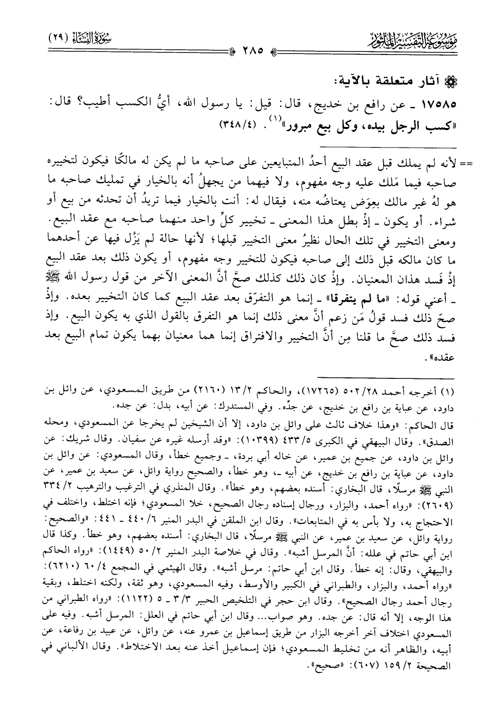 ١٧٥٨٥ - عن رافع بن خديج، قال: قيل: يا رسول الله، أيُّ الكسب أطيب؟ قال: «كسب الرجل بيده، وكل بيع مبرور» (¬١). (٤/ ٣٤٨)