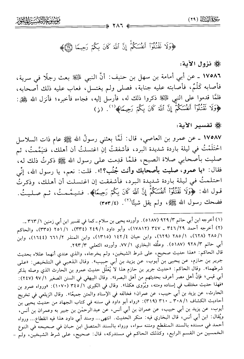 ١٧٥٨٦ - عن أبي أمامة بن سهل بن حنيف: أنّ النبي - عليه السلام - بعث رجلًا في سرية، فأصابه كَلْمٌ، فأصابته عليه جنابة، فصلى ولم يغتسل، فعاب عليه ذلك أصحابه، فلمّا قدموا على النبي - عليه السلام - ذكروا ذلك له، فأرسل إليه، فجاءه فأخبره؛ فأنزل الله - عز وجل -: {ولا تقتلوا أنفسكم إن الله كان بكم رحيما} (¬١). (ز)