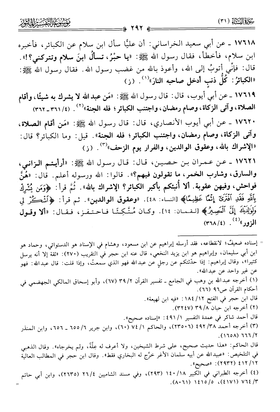 ١٧٦١٨ - عن أبي سعيد الخراساني: أن عليًّا سأل ابن سلام عن الكبائر، فأخبره ابن سلام، فأخطأ، فقال رسول الله - صلى الله عليه وسلم -: «يا حبْرُ، تسألُ ابنَ سلام وتتركني؟!». قال: فإنِّي أتوبُ إلى الله، وأعوذ بالله من غضب رسول الله. فقال رسول الله - صلى الله عليه وسلم -: «الكبائرُ: كُلُّ ذنبٍ أدخل صاحبه النارَ» (¬١). (ز)