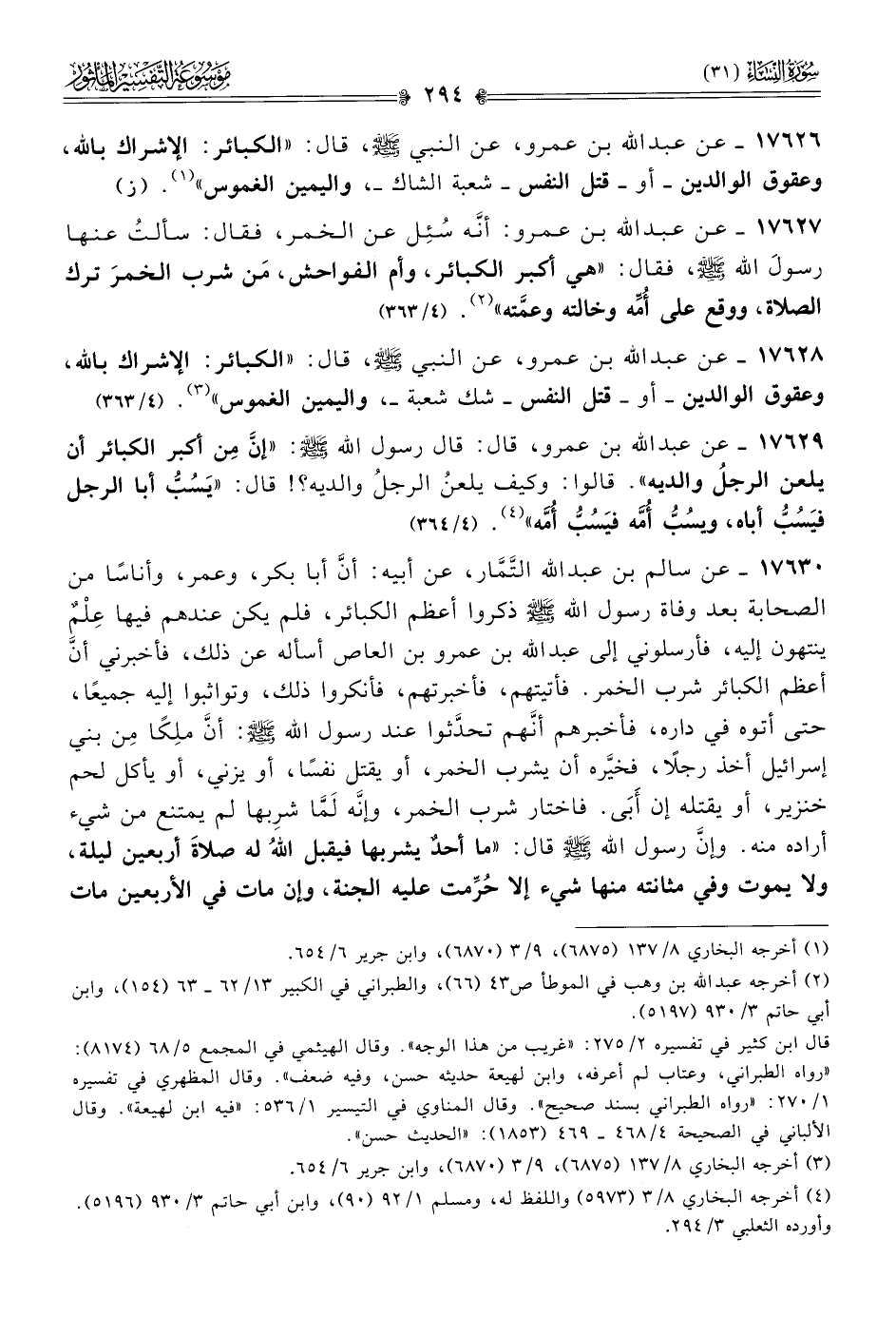 ١٧٦٢٦ - عن عبد الله بن عمرو، عن النبي - صلى الله عليه وسلم -، قال: «الكبائر: الإشراك بالله، وعقوق الوالدين -أو- قتل النفس -شعبة الشاك-، واليمين الغموس» (¬١). (ز)