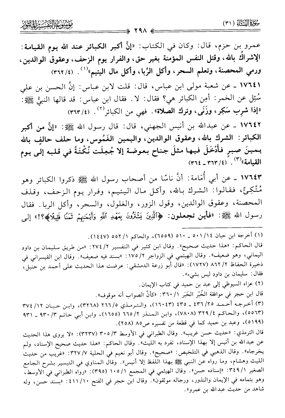 عمرو بن حزم، قال: وكان في الكتاب: «إنّ أكبر الكبائر عند الله يوم القيامة: الإشراكُ بالله، وقتل النفس المؤمنة بغير حق، والفرار يوم الزحف، وعقوق الوالدين، ورمي المحصنة، وتعلم السحر، وأكل الرِّبا، وأكل مال اليتيم» (¬١). (٤/ ٣٦٢)