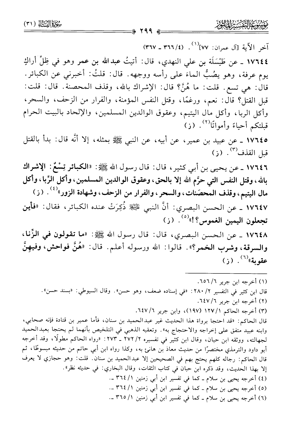 ١٧٦٤٦ - عن يحيى بن أبي كثير، قال: قال رسول الله - صلى الله عليه وسلم -: «الكبائر تِسْعٌ: الإشراك بالله، وقتل النفس التي حرَّم الله إلا بالحق، وعقوق الوالدين المسلمين، وأكل الرِّبا، وأكل مال اليتيم، وقذف المحصَنات، والسحر، والفرار من الزحف، وشهادة الزور» (¬٤). (ز)