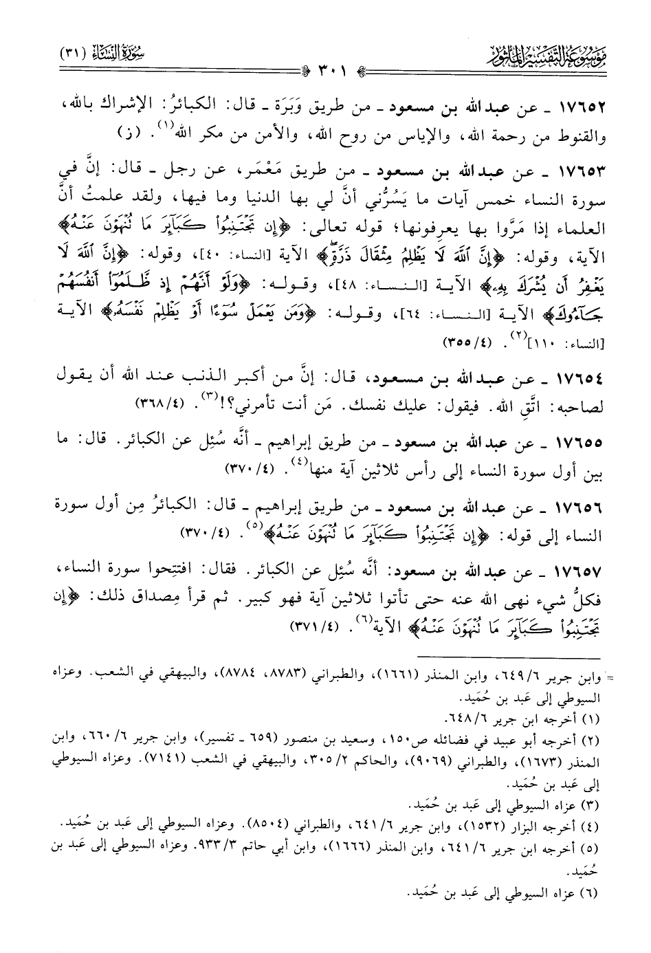 ١٧٦٥٥ - عن عبد الله بن مسعود -من طريق إبراهيم- أنّه سُئِل عن الكبائر. قال: ما بين أول سورة النساء إلى رأس ثلاثين آية منها (¬٤). (٤/ ٣٧٠)