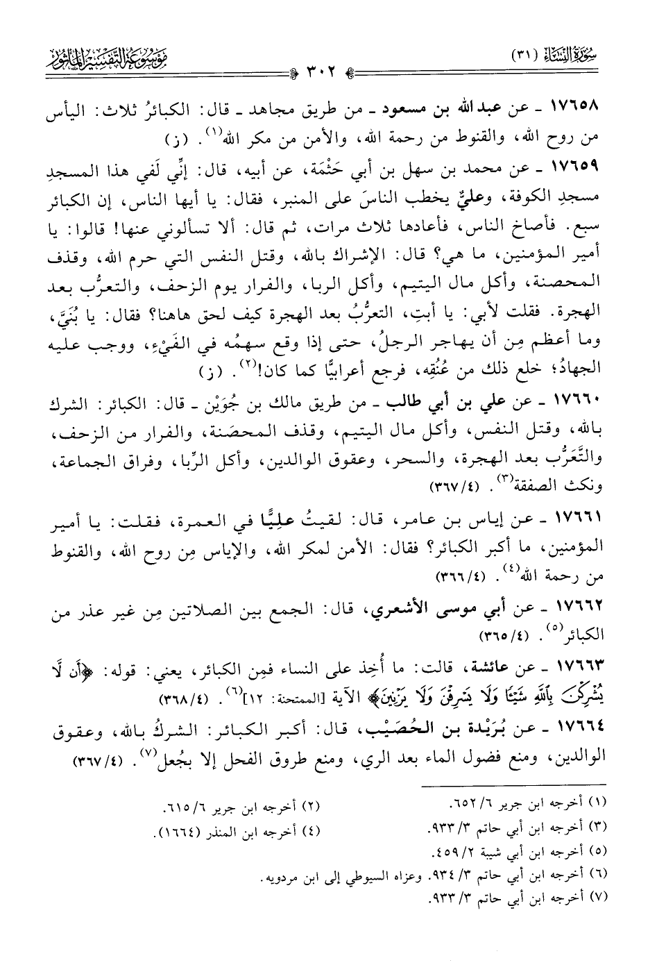 ١٧٦٦٠ - عن علي بن أبي طالب -من طريق مالك بن جُوَيْن- قال: الكبائر: الشرك بالله، وقتل النفس، وأكل مال اليتيم، وقذف المحصَنة، والفرار من الزحف، والتَّعَرُّب بعد الهجرة، والسحر، وعقوق الوالدين، وأكل الرِّبا، وفراق الجماعة، ونكث الصفقة (¬٣). (٤/ ٣٦٧)