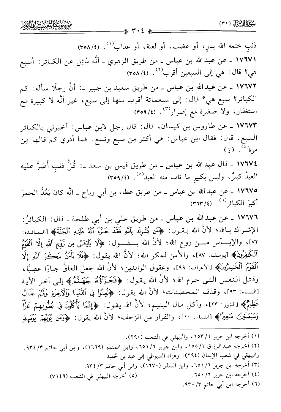 ١٧٦٧٦ - عن عبد الله بن عباس -من طريق علي بن أبي طلحة- قال: الكبائرُ: الإشراك بالله؛ لأنّ الله يقول: {من يشرك بالله فقد حرم الله عليه الجنة} [المائدة: ٧٢]، والإيأس من روح الله؛ لأنّ الله يقول: {لا ييئس من روح الله إلا القوم الكافرون} [يوسف: ٨٧]، والأمن لمكر الله؛ لأنّ الله يقول: {فلا يأمن مكر الله إلا القوم الخاسرون} [الأعراف: ٩٩]، وعقوق الوالدين؛ لأنّ الله جعل العاقَّ جبارًا عصِيًّا، وقتل النفس التي حرم الله؛ لأنّ الله يقول: {فجزاؤه جهنم} إلى آخر الآية [النساء: ٩٣]، وقذف المحصنات؛ لأنّ الله يقول: {لعنوا في الدنيا والآخرة ولهم عذاب عظيم} [النور: ٢٣]، وأكل مال اليتيم؛ لأنّ الله يقول: {إنما يأكلون في بطونهم نارا وسيصلون سعيرا} [النساء: ١٠]، والفرار من الزحف؛ لأنّ الله يقول: {ومن يولهم يومئذ