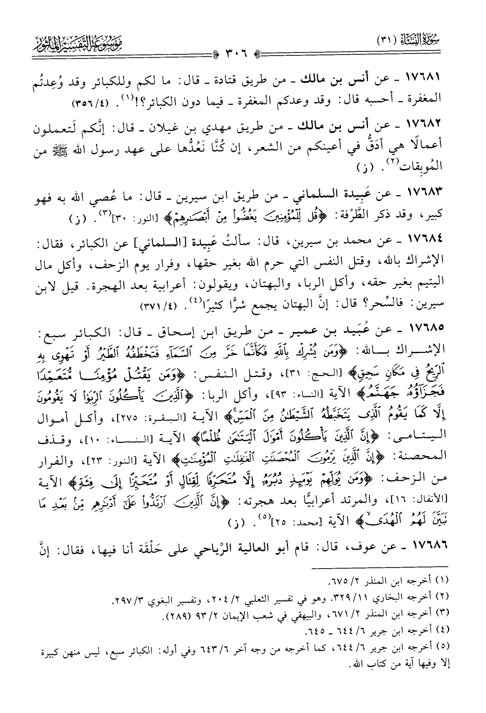 (¬٥) أخرجه ابن جرير ٦/ ٦٤٤، كما أخرجه من وجه آخر ٦/ ٦٤٣ وفي أوله: الكبائر سبع، ليس منهن كبيرة إلا وفيها آية من كتاب الله.