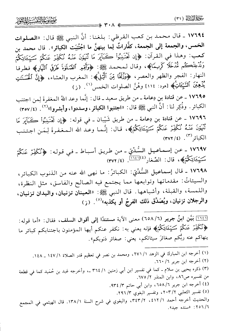 ١٧٦٩٦ - عن قتادة بن دِعامة -من طريق شَيْبان- في قوله: {إن تجتنبوا كبائر ما تنهون عنه نكفر عنكم سيئاتكم}، قال: إنّما وعد الله المغفرةَ لِمَن اجتنب الكبائر (¬٣). (٤/ ٣٧٢)