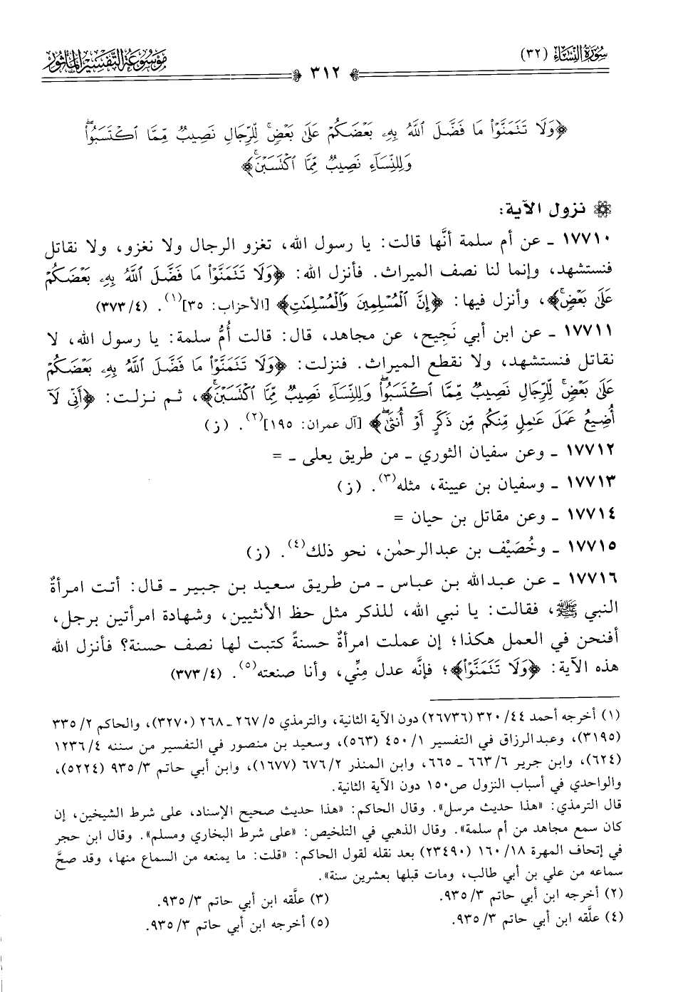 ١٧٧١٦ - عن عبد الله بن عباس -من طريق سعيد بن جبير- قال: أتت امرأةٌ النبي - صلى الله عليه وسلم -، فقالت: يا نبي الله، للذكر مثل حظ الأنثيين، وشهادة امرأتين برجل، أفنحن في العمل هكذا؛ إن عملت امرأةٌ حسنةً كتبت لها نصف حسنة؟ فأنزل الله هذه الآية: {ولا تتمنوا}؛ فإنّه عدل مِنِّي، وأنا صنعته (¬٥). (٤/ ٣٧٣)